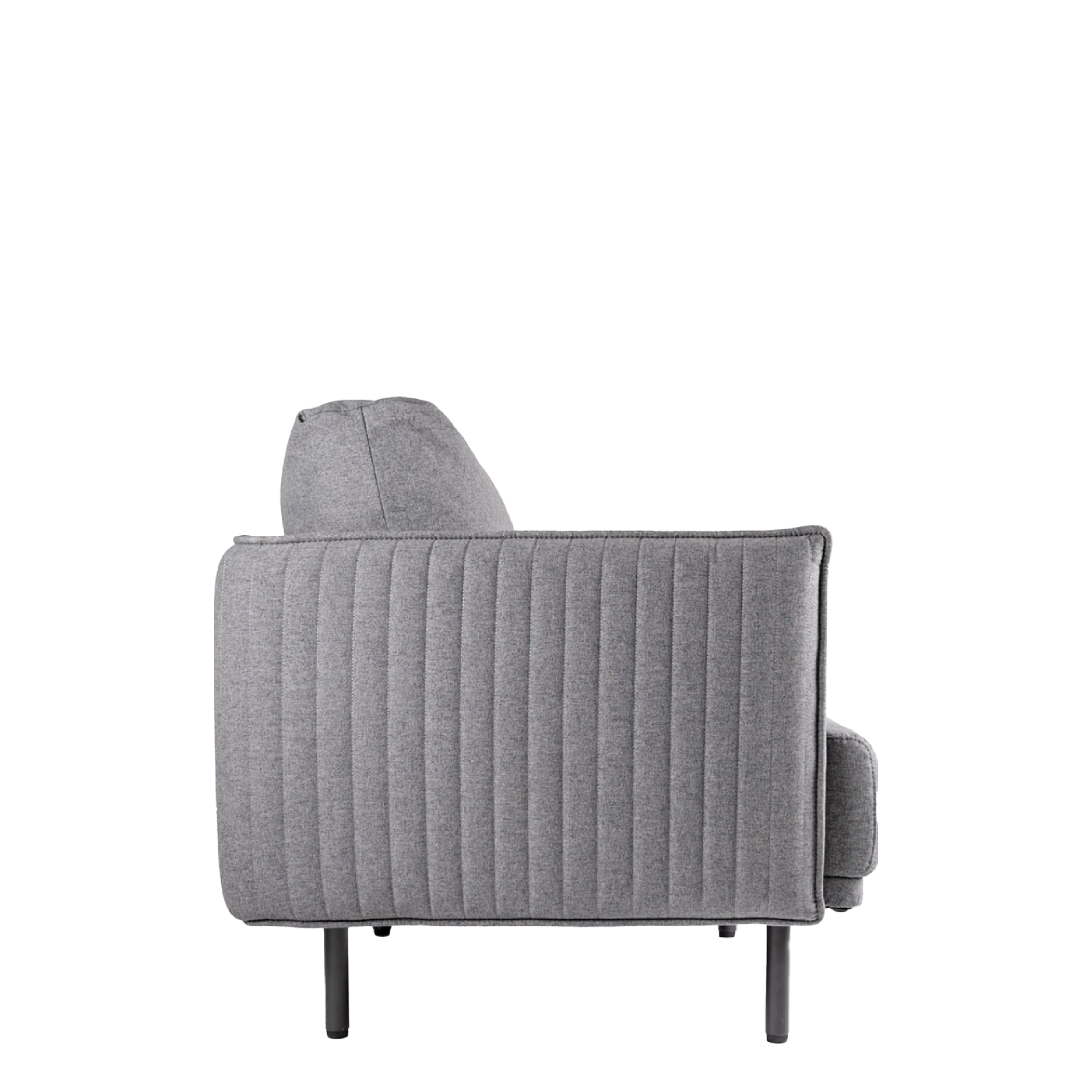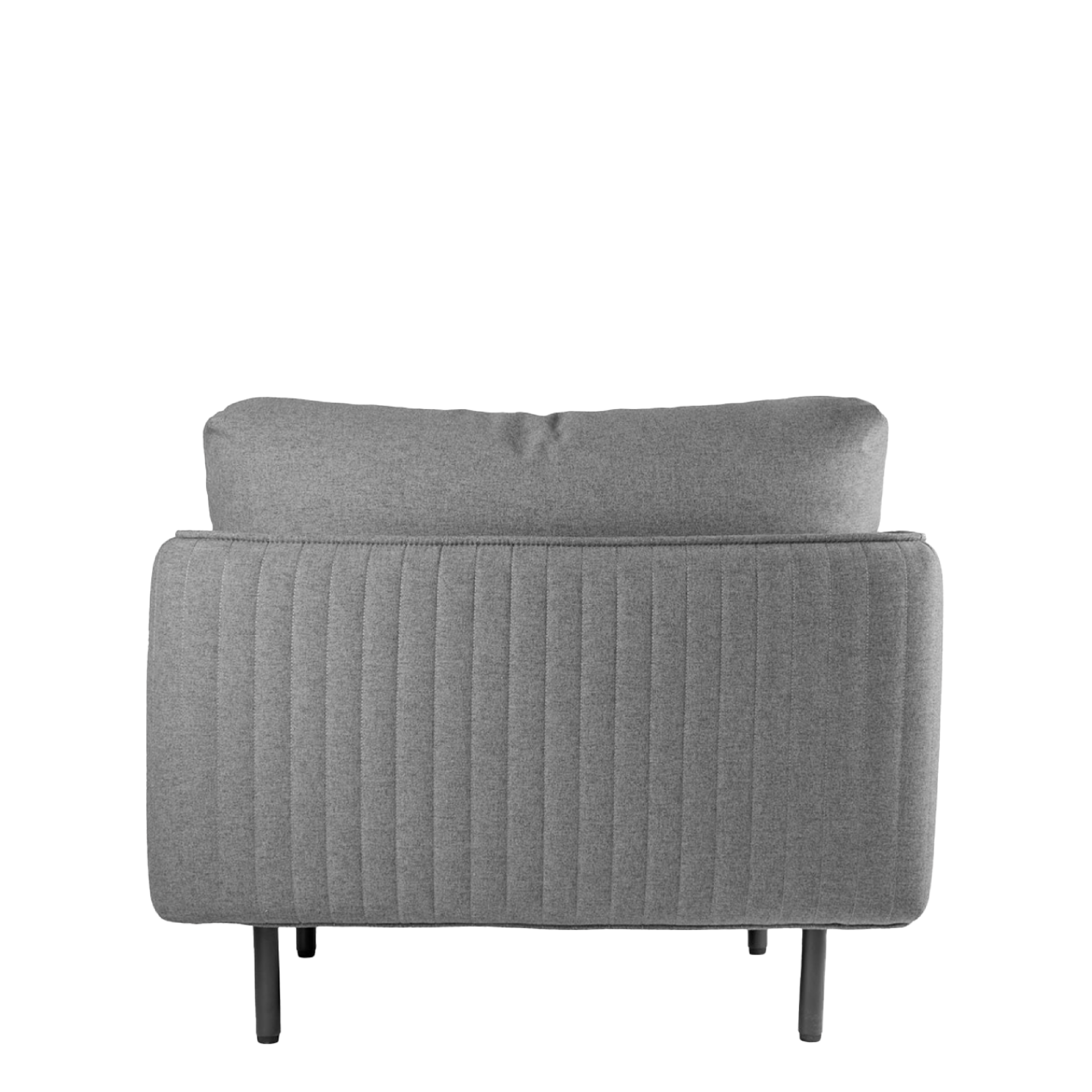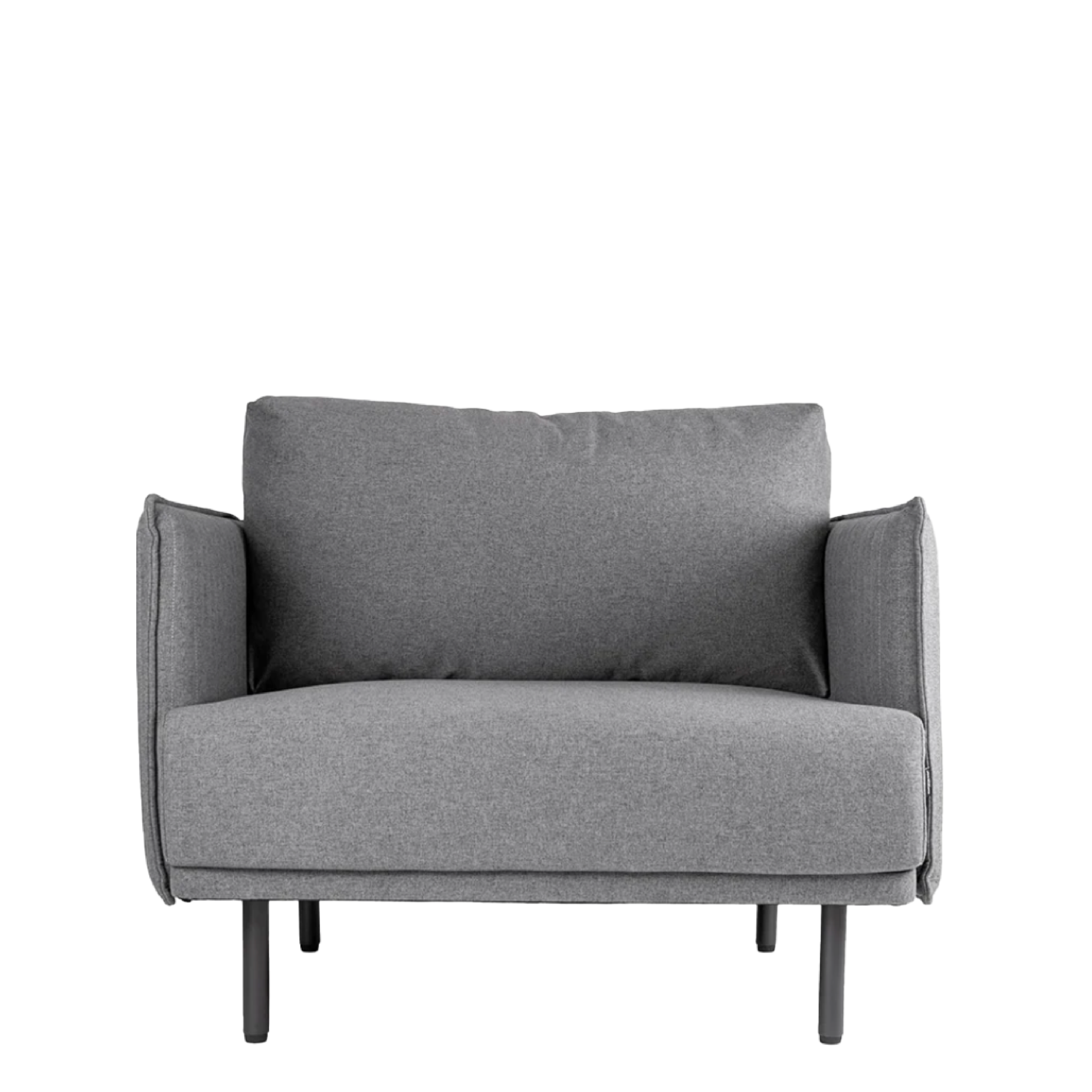 Sofá de 1 plaza. Tapizado en color gris en tela de hilos 60% algodón y 40% poliéster, capitonado recto y pespuntado, suave al tacto.