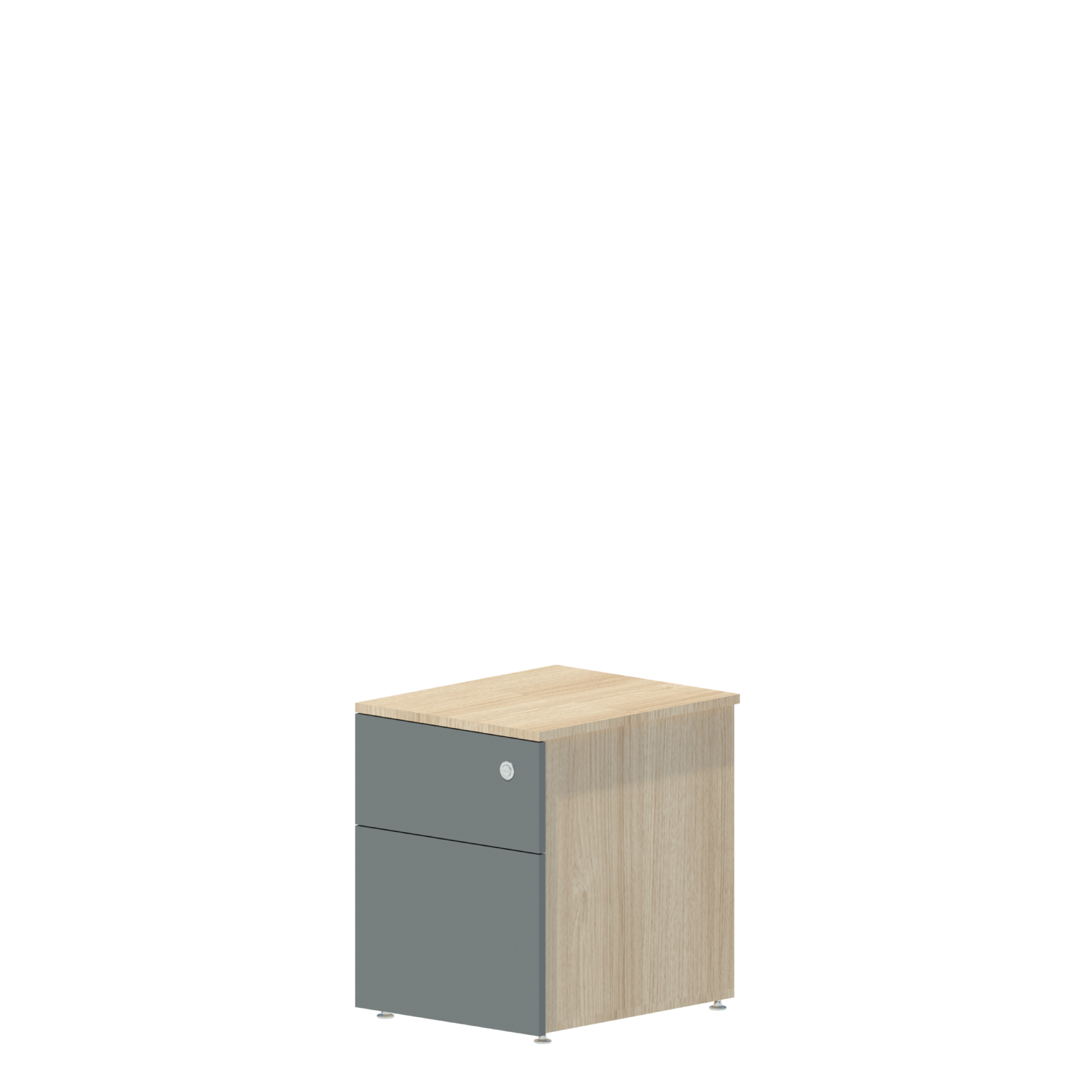 Cajonera 1+1 con cajón papelero y gaveta, equipada con correderas metálicas embalinadas de extensión completa para un deslizamiento suave y duradero. Incorpora cerradura de seguridad de cilindro intercambiable con sistema de bloqueo total. Incluye regatones con acabado cromo y ofrece opción de cojín como accesorio opcional.